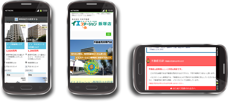 ホームページを運営されている中本不動産様は、会社の紹介などを行うオフィシャルコーポレートサイト、賃貸物件を取り扱う賃貸サイト、売買物件を取り扱うイエステーション飯塚店と、3つに分けて展開いたしました。こちらは中本不動産様の売買物件サイト「イエステーション飯塚店」です。